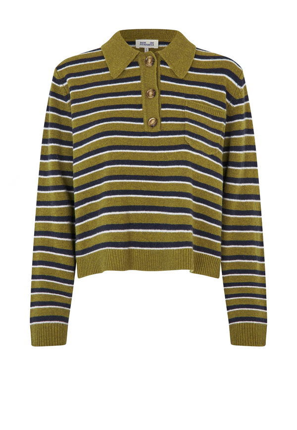 Das Cori Poloshirt von Baum und Pferdgarten in der frischen Farbe Ivy Green Stripe ist dein kuscheliger Freund für entspannte Tage. Der klassische Polokragen mit drei Knöpfen trifft hier auf eine zeitlose Streifenstruktur, die dem Strickpullover eine verspielte Leichtigkeit verleiht 😊. Schön langärmelig und mit gerippten Abschlüssen an Kragen, Ärmel und Bund ist er wie gemacht für gemütliche Momente Zuhause oder coole Looks mit Jeans am Wochenende. Eine dezente Brusttasche sorgt für charmanter Alltagstauglichkeit, während die locker-sitzende Passform dich nie einengt, sondern einfach schön begleitet. Ein Wohlfühl-Essential, das du immer wieder gerne aus dem Schrank ziehst.