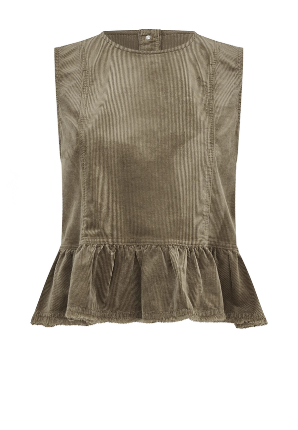 Das Madinel Top von Baum und Pferdgarten in der warmen Nuance Savannah Tan verführt mit verspielt-elegantem Charme. Die zarte Kordstruktur und die liebevoll gearbeitete Rüsche am Saum wirken leicht und feminin, während die locksere, ärmellose Silhouette für mühelosen Stil sorgt. Der attraktive Knopfverschluss am Rücken setzt ein interessantes Detail und lässt dich lässig-leger strahlen. Dieses Top zieht alle Blicke auf dich – ob kombiniert mit deiner Lieblingsjeans oder einem fließenden Rock. Perfekt für laue Sommertage oder stylische Freizeitlooks, die wie gemacht sind für trendige Statements :)