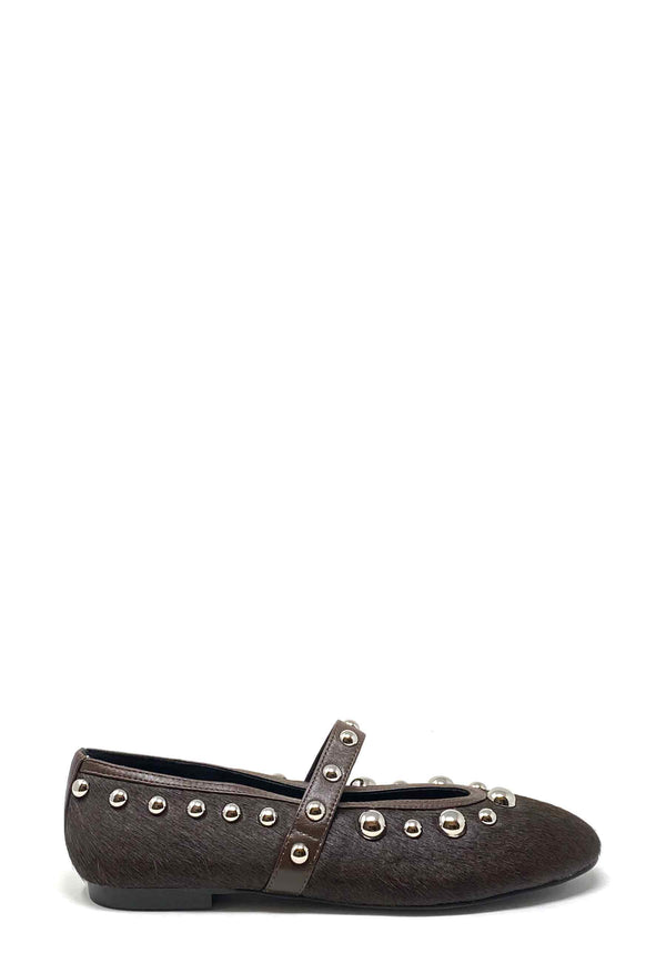 Dieser Ballerina von Bibi Lou setzt auf rockige Eleganz: Das edle, braune Ponyfell-Finish wird durch glänzende Rundnieten in Silber und einen schmalen Riemen mit Schnalle akzentuiert. Die Kombination aus femininer Silhouette und markanten Details verleiht dem Schuh eine rebellisch-schicke Note. Perfekt für alle, die klassische Formen mit modischem Statement verbinden möchten.