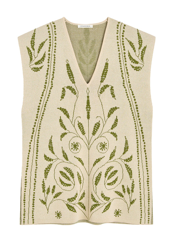 Der Isolt Pullunder von By Malene Birger in der Farbe Garden Jacquard ist eine poetische Hommage an üppige Gärten und ruhige Hinterhöfe. Mit seinem locker geschnittenen Design, dem tiefen V-Ausschnitt und den hohen Seitenschlitzen verleiht er jedem Outfit eine elegante Leichtigkeit. Die grashüpfergrünen, gestickten Gartenranken auf dem cremefarbenen Hintergrund setzen einen stilvollen Akzent und machen den Pullunder zu einem echten Blickfang. Kombiniere ihn mit den passenden Jorith-Hosen für einen harmonischen Look oder trage ihn über einem schlichten Kleid für einen modernen Twist. Ein vielseitiges Piece, das sich sowohl für den Alltag als auch für besondere Anlässe eignet. 🌿✨