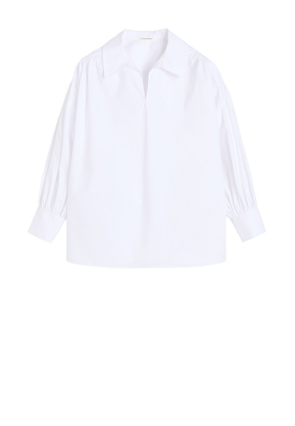 Die by Malene Birger Leonora Bluse in Pure White kommt in einem eleganten Tunika-Schnitt und verbindet minimalistischen Chic mit gemütlicher Leichtigkeit. Der scharfe Kragen und der feminine V-Ausschnitt verleihen dem Look sofort eine moderne Note, während die geknöpften Manschetten und die seitlichen Schlitze für subtile Dynamik sorgen. Der oversized Schnitt lässt dich stilvoll lässig wirken und schenkt Bewegungsfreiheit – ideal für Tage, an denen du dich elegant und entspannt zugleich fühlen willst 😊. Das reine Pure-White und das gestickte Monogramm machen diese Bluse zur unkomplizierten Ergänzung deines Kleiderschranks. Trage sie solo mit Jeans oder halbtuckert in einen Rock – und du bist immer stilsicher unterwegs. Ein echtes Lieblingsstück, das du immer wieder neu interpretieren wirst.