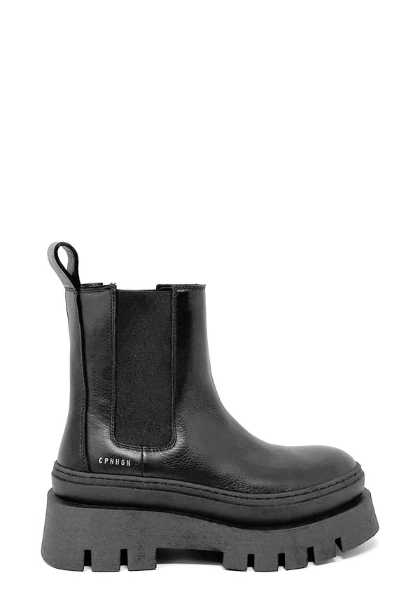 Der CPH686 Chelseaboot in Black von Copenhagen ist ein Must-Have in jeder Schuhsammlung. Die dicke Platformsohle mit dem schönen Profil streckt deine Beine wunderschön in die Länge. Ein dezenter Mud-Guard zieht sich tonal über die Sohle. Das Logo befindet sich an der Außenseite in Gold und rundet den Look ab.