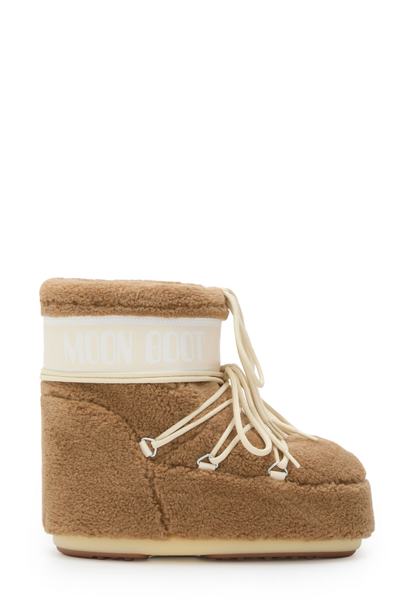Die Icon Low Camel Fleece Boots von Moon Boot in der Farbe Camel vereinen echten Winter-Glow mit urbane Verspieltheit. Das von Kopf bis Fuß mit flauschigem Fleece umhüllte Obermaterial sorgt für kuschelige Wärme und macht jeden Schritt zum Komfortmoment. Die kurze, aber voluminöse Silhouette erinnert an Schneeabenteuer und lange Winterspaziergänge, während die gummierte Laufsohle mit Saugnäpfen sicheren Grip verspricht – ideal für nasse und rutschige Wege. Abgerundet wird das Design durch silberfarbene Metallösen, ein Logo-Panel und einen praktischen Drawstring oben, der ein wenig Streetwear-Vibe mitbringt 😊. Trotz auffälliger Präsenz wirkt der Look erstaunlich vielseitig: Kombiniere die Boots mit engen Jeans oder einem Midi-Röckchen, um einen coolen Bruch zu schaffen.