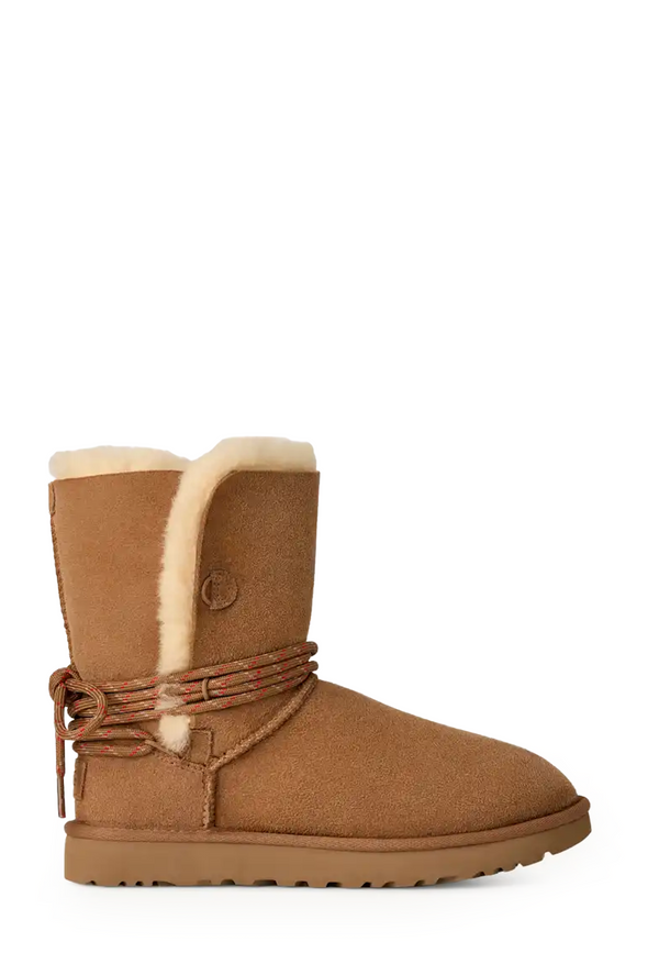 Der UGG Classic Bailey Tie Boot in Chestnut ist eine moderne Neuinterpretation des beliebten Klassikers – super cozy und stilvoll zugleich. Das luxuriöse Twinface-Schaffell macht sie unglaublich weich und wärmend, während du sie hoch tragen kannst oder umkrempelst, um die flauschige Seite zu zeigen. Die raffinierte Schnürung hinten mit Satin- oder Ticked-Laces verleiht dir spielerische Vielseitigkeit für deinen Look. Die robuste Sugarcane‑EVA‑Sohle ist nachhaltig und sorgt für leichten Tragekomfort bei jedem Schritt. Mit subtil geprägtem UGG‑Logo strahlt der Boot dennoch zurückhaltende Eleganz aus – ein echtes Wohlfühlerlebnis für deine Füße 😊. Ein perfekter Begleiter für alle, die Stil und Gemütlichkeit lieben.