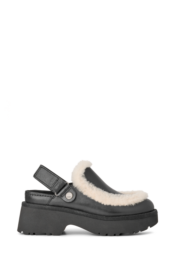 Der Esmee Leather Clog von UGG in klassischem Schwarz kombiniert skandinavische Schlichtheit mit einem Hauch von Luxus. Der Clog verfügt über ein Obermaterial aus echtem Leder und einen 10 mm breiten Shearling-Spill-Naht, die für einen luxuriösen Touch sorgt. Der verstellbare Fersenriemen mit Klettverschluss ermöglicht eine individuelle Passform, während die leichte EVA-Sohle für Komfort bei jedem Schritt sorgt. Ein echtes Must-have für deinen Herbst-Winter-Look! 🍂🖤