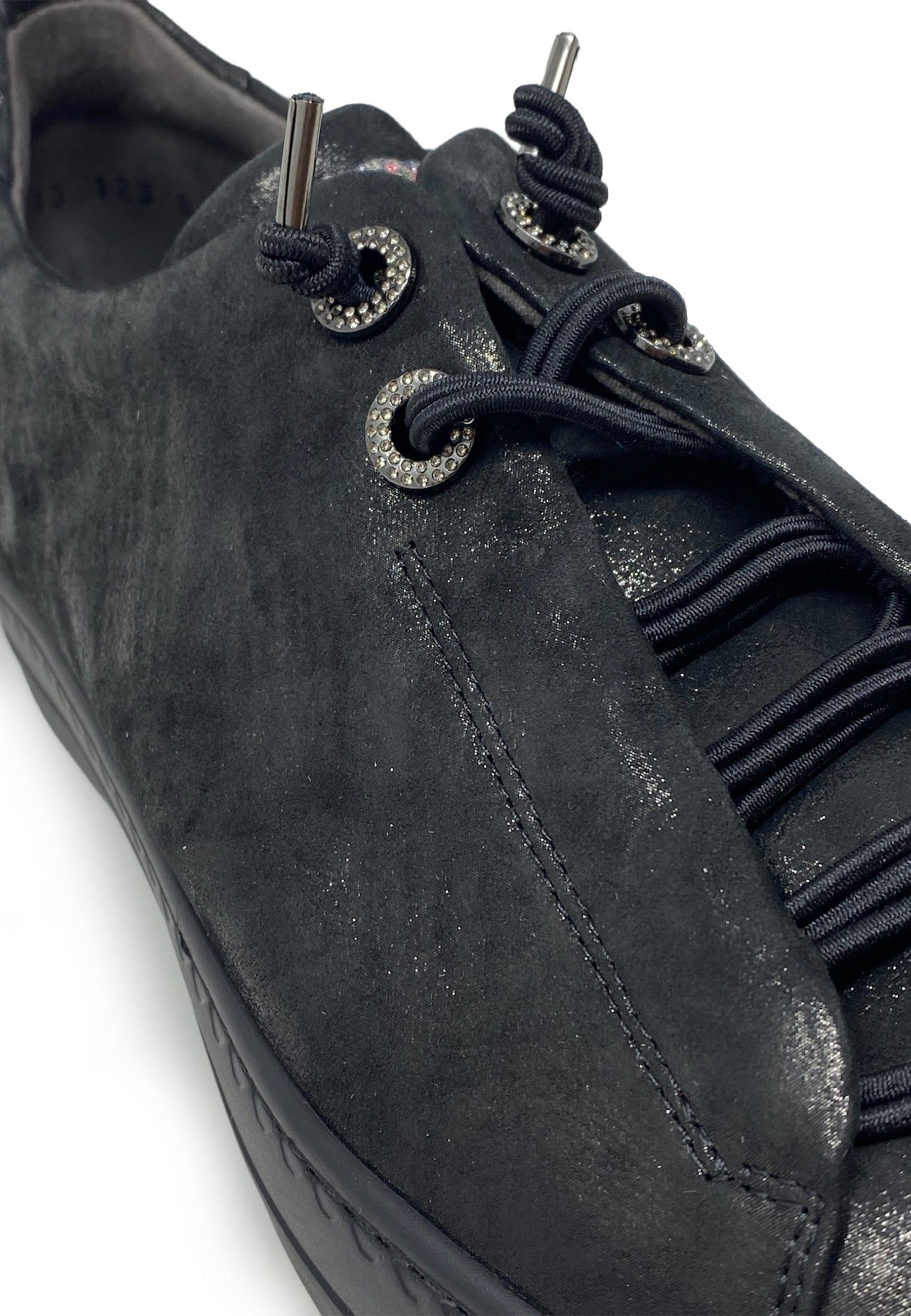 Der 5417 Sneaker von Paul Green in Black Glossy ist ein echter Hingucker für alle, die es stilvoll und bequem mögen. Das schimmernde Glattleder verleiht dem sportlich-eleganten Design eine edle Tiefe, während die funkelnden Ösen mit Kristallbesatz für ein charmantes Detail sorgen ✨. Die breite Gummisohle mit dezentem Plateau rundet das Design perfekt ab und schenkt dir einen kleinen Extra-Boost – optisch wie auch beim Komfort. Dank der elastischen Schnürung sitzt der Schuh wie angegossen und lässt sich ganz easy an- und ausziehen. Ob zur Jeans oder zum Kleid: Dieser Sneaker bringt Glanz in deinen Alltag und passt sich deinem Look mit spielerischer Leichtigkeit an 😍. Ein modischer Mix aus Glamour und Lässigkeit – genau wie du!